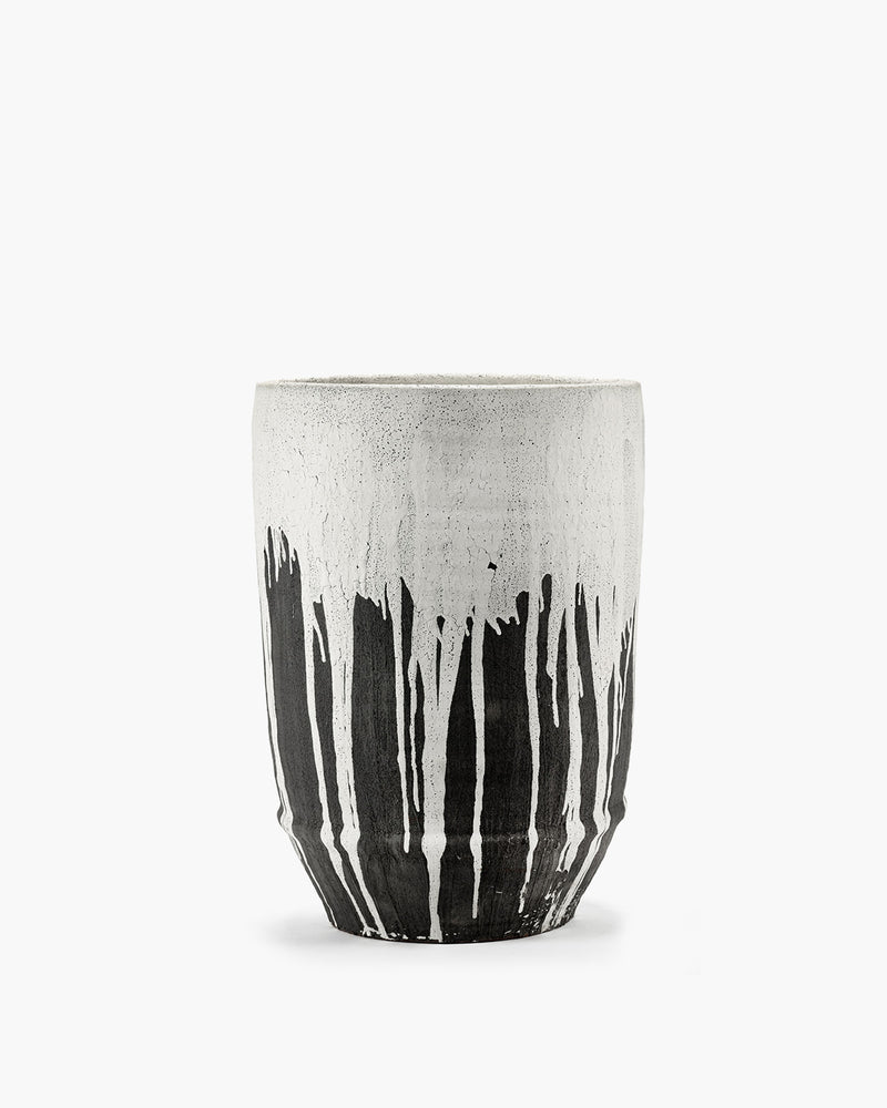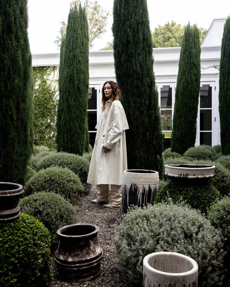 Kelly Wearstler's first outdoor ceramic collection highlights artisanal craftsmanship and natural glazing. The collection includes four distinct design languages inspired by natural phenomena: Book, Dune, Rift and Mesa. Rift is defined by strong vertical lines, Dune offers softer, fluid curves, Book features weathered rectangular volumes, and Mesa brings dimension through ridged detailing. The glazes are the soul of the collection. Their rich, dynamic surfaces transform throughout the day, catching and reflecting light in ways that make each piece feel alive and ever-changing.